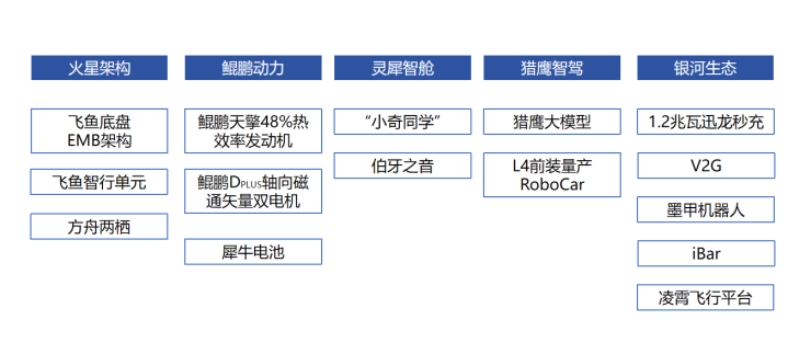 技术分享围绕五大板块展开,分别是火星架构、鲲鹏动力、灵犀智舱、猎鹰智驾、银河生态。这五大板块之下,又有很多不明觉厉的“新词儿”,为了方便呈现,干脆整理成一张图,如下: